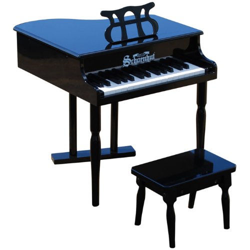 Mini Baby Grand Piano - Classic 30 Key. The Schoenhut miniature version of a baby grand piano is designed to encourage a child to play and develop a love of music. Elegant in appearance with graceful spindle legs, yet extremely durable and sturdy, it makes a beautiful addition to any home. Lovely chime-like tones are produced by small hammers striking metal rods, the sound that makes Schoenhut toy pianos unique. The two-and one-half-octave span of 30 full-width keys provides a good foundation for the transition to a larger model. Includes the Schoenhut Learning System and bench. Assembly required. Recommended for ages 3+. Dimensions: Piano: 19.25" L x 19.75" W x 20.5" H; 23 lbs. Bench: 9" L x 7.75" W x 20.5" H